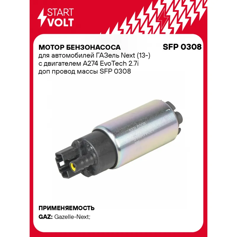 Мотор бензонасоса для автомобилей ГАЗель Next (13-) с двигателем A274 EvoTech 2.7i доп провод массы Характеристики: Артикул: SFP 0308 OEM номера: 61.1139-01, A21R33.1139.010 Номинальное напряжение, В: 12 Производительность, л/ч: 95 Сила тока, А: 6.5 Номинальное давление, бар: 3 Количество на автомобиль: 1 Подходит для авто: Г... Читать полностью →