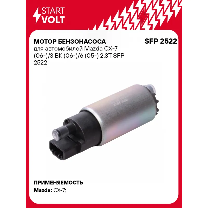 Мотор бензонасоса для автомобилей Mazda CX-7 (06-)/3 BK (06-)/6 (05-) 2.3T Характеристики: Артикул: SFP 2522 OEM номера: L3M8-13-350B Количество на автомобиль: 1 Номинальное напряжение, В: 12 Производительность, л/ч: 90 Номинальное давление, бар: 3 Подходит для авто: Mazda CX-7 (07-) Для проверки применяемости отправьте VIN автомобиля через вкладку "Есть вопросы о товаре?" Комплектация: Топливный насос - 1 шт Паспорт изделия/гарантиийный талон - 1 шт Гарантия: от 1 года.