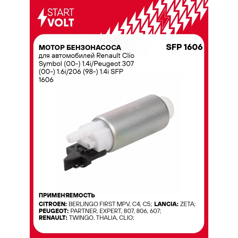 Мотор бензонасоса для автомобилей Renault Clio Symbol (00-) 1.4i/Peugeot 307 (00-) 1.6i/206 (98-) 1.4i Характеристики: Артикул: SFP 1606 OEM номера: 1525.H8, 1525 AR, 1525 Q8, 1525 N8, 1525 F8, 00 001 525 H8, 1525.Y1, 1525S9, 1525 N7, 77 00 431 414, 0 986 580 252, 0 986 580 256, 0 986 580 260, 0 986 580 310, 0 986 580 960, 0 986 580 961, 1333-02, 1333-19, 133331, 133333, 1333-47 Количество на автомобиль: 1 Номинальное напряжение, В: 12 Производительность, л/ч: 90 Номинальное давление, бар: 3 Комплектация: Топливный насос - 1 шт Паспорт изделия/гарантийный талон - 1 шт Гарантия: от 1 года.
