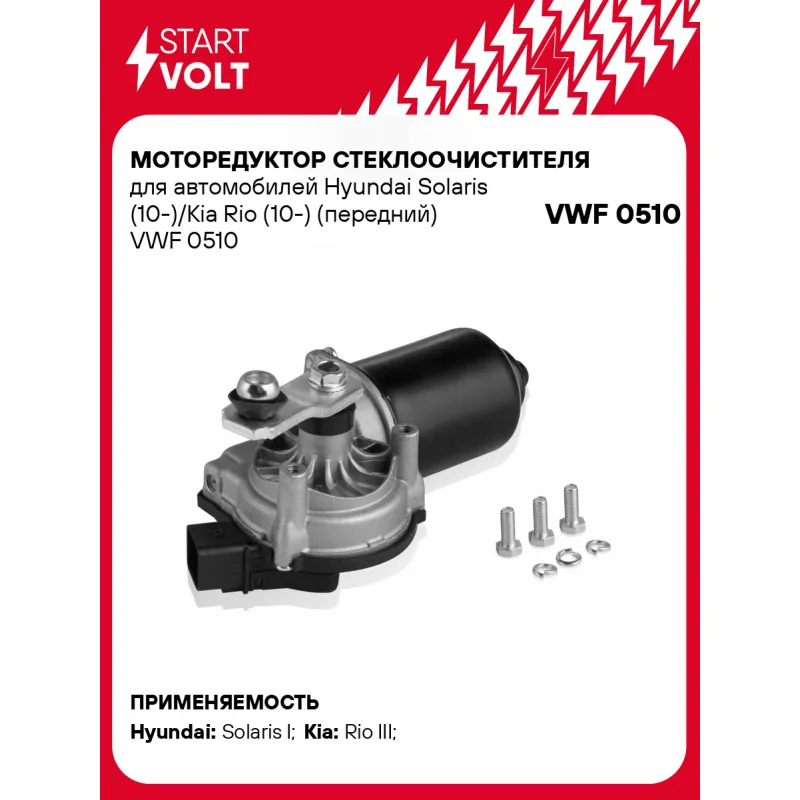 Моторедуктор стеклоочистителя для автомобилей Hyundai Solaris (10-)/Kia Rio (10-) (передний) Характеристики: Артикул: VWF 0510 OEM номера: 98110-1R000 Количество на автомобиль: 1 Сторона установки: спереди Номинальное напряжение, В: 12 Сила тока при малой скорости вращения, А: 2 Малая скорость вращения, об/мин: 45 Крутящий момент при малой скорости вращения, Н*м: 23 Диаметр выходного вала: 10 Мощность, Вт: 10 Сопутствующий товар: Трапеции стеклоочистителя: VWA 08L4 Подходит для авто: Hyundai Solaris I (10-) Kia Rio III (11-) Для проверки применяемости отправьте VIN автомобиля через вкладку "Есть вопросы о товаре?" Комплектация: Моторедуктор стеклоочистителя - 1 шт Паспорт изделия/гарантийный талон - 1 шт Болт - 3 шт Пружинная шайба - 3 шт Гарантия: от 1 года.