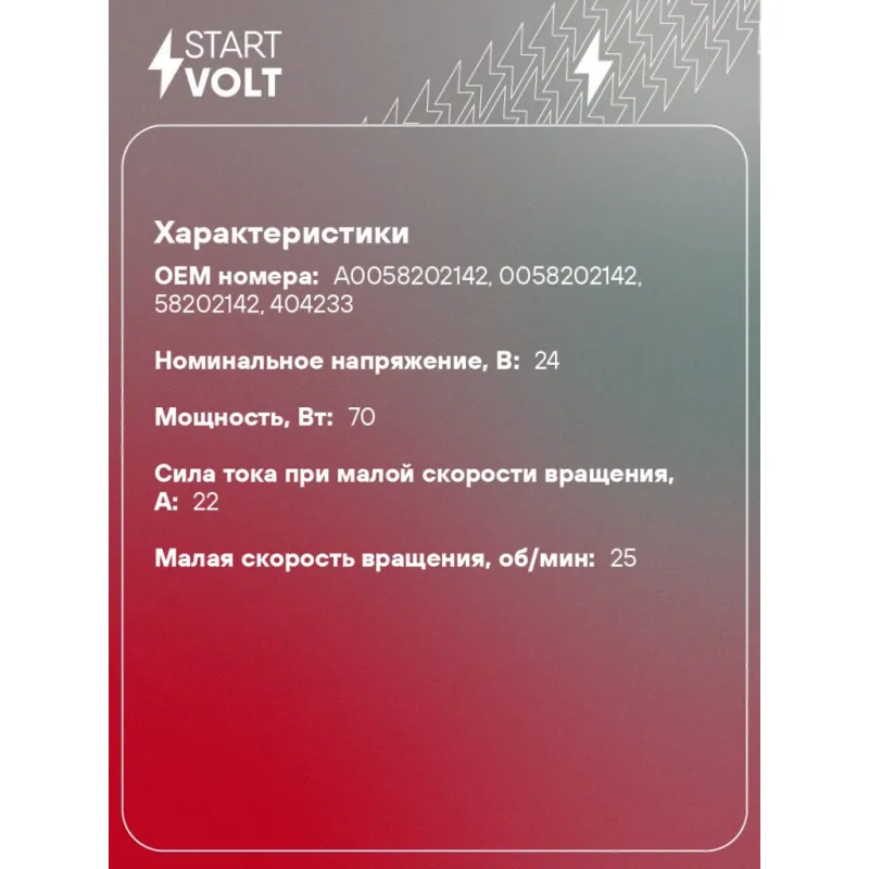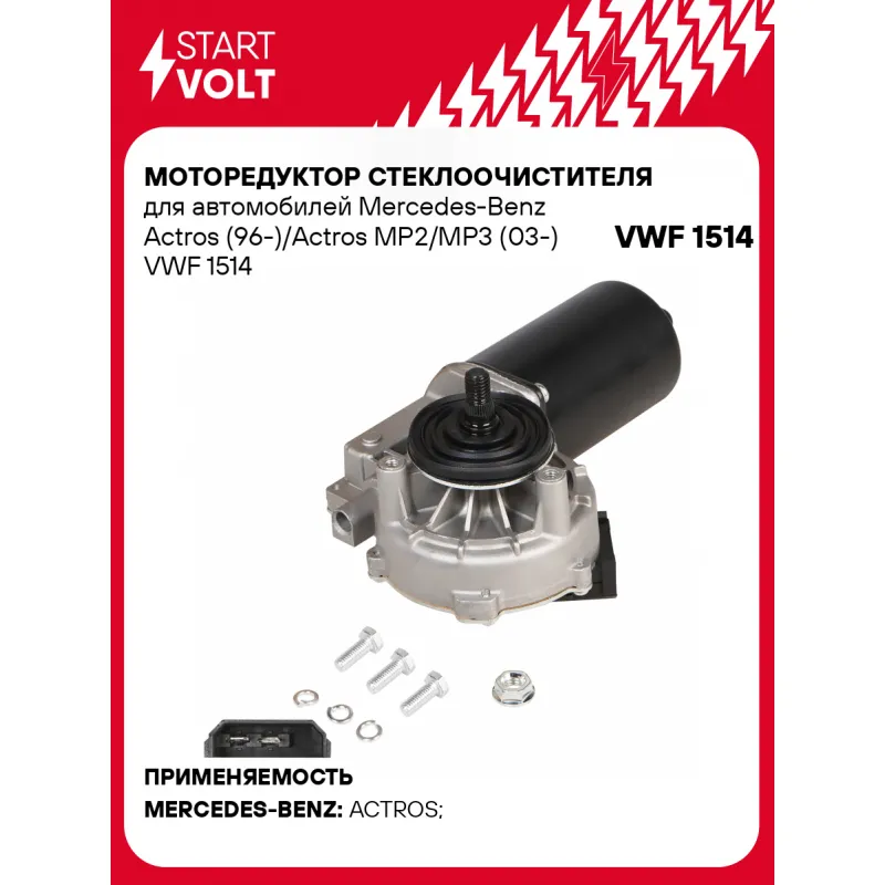Моторедуктор стеклоочистителя для автомобилей Mercedes-Benz Actros (96-)/Actros MP2/MP3 (03-) Характеристики: Артикул: VWF 1514 OEM номера: A0058202142, 0058202142, 58202142, 404233 Количество на автомобиль: 1 Сторона установки: спереди Номинальное напряжение, В: 24 Сила тока при малой скорости вращения, А: 22 Малая скорость вращения, об/мин: 25 Крутящий момент при малой скорости вращения, Н*м: 33 Диаметр выходного вала: 12 Мощность, Вт: 70 Комплектация: Паспорт изделия/гарантийный талон - 1 шт Моторедуктор стеклоочистителя - 1 шт Болт - 3 шт Пружинная шайба - 3 шт Гайка - 1 шт Гарантия: от 1 года.