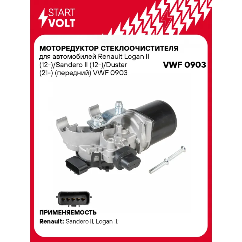 Моторедуктор стеклоочистителя для автомобилей Renault Logan II (12-)/Sandero II (12-)/Duster (21-) (передний) Характеристики: Артикул: VWF 0903 OEM номера: 288159333R, W000034506 Количество на автомобиль: 1 Сторона установки: спереди Номинальное напряжение, В: 12 Сила тока при малой скорости вращения, А: 4.5 Малая скорость вращения, об/мин: 35 Крутящий момент при малой скорости вращения, Н*м: 3.5 Мощность, Вт: 10 Сопутствующий товар: Трапеции стеклоочистителя: VWA 0903 Подходит для авто: Renault Sandero II (14-), Logan II (12-), Sandero II (14-) Для проверки применяемости отправьте VIN автомобиля через вкладку "Есть вопросы о товаре?" Комплектация: Моторедуктор стеклоочистителя - 1 шт Паспорт изделия/гарантийный талон - 1 шт Винт - 2 шт Гарантия: от 1 года.
