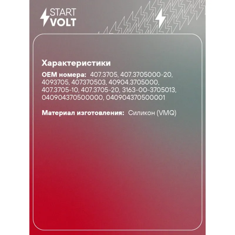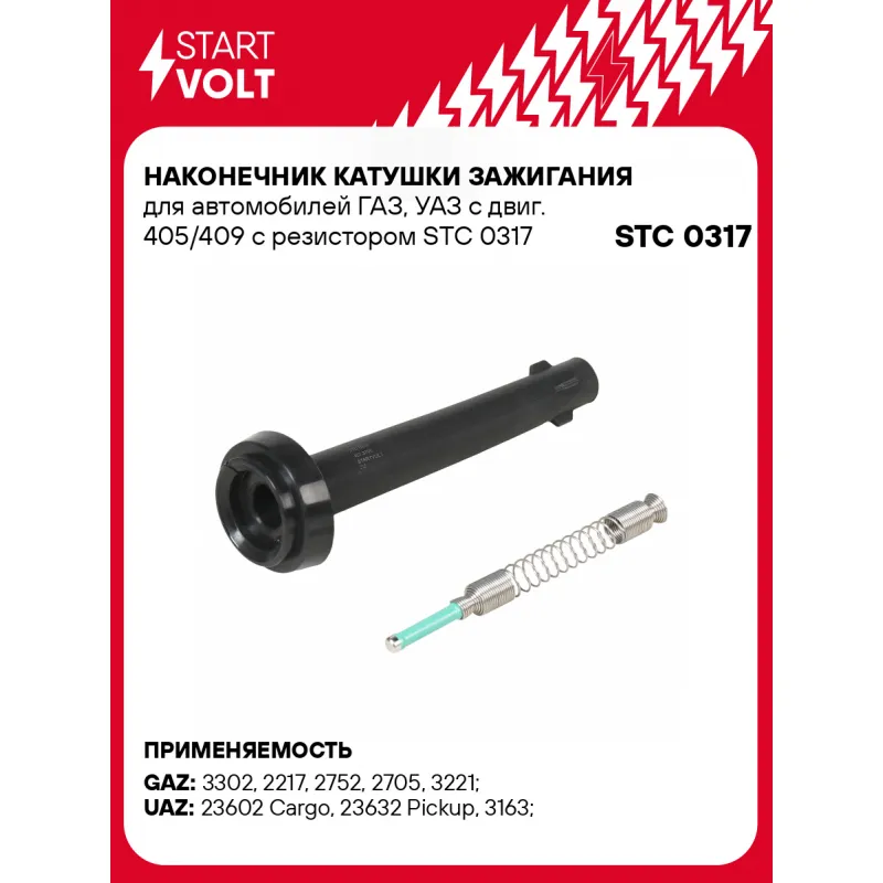 Наконечник катушки зажигания для автомобилей ГАЗ, УАЗ с двиг. 405/409 с резистором Характеристики: Артикул: STC 0317 OEM номера: 407.3705, 407.3705000-20, 4093705, 407370503, 40904.3705000, 407.3705-10, 407.3705-20, 3163-00-3705013, 040904370500000, 040904370500001 Материал изготовления: Силикон Количество на автомобиль: 4 Длина: 134mm Подходит для авто: ГАЗ 3302, 3302, 2217, 2217, 2752, 2752, 2705, 2705, 3221, 3221 УАЗ 23602 Cargo (08-), 23632 Pickup (08-), 3163 (Patriot) (05-), 315195 Для проверки применяемости отправьте VIN автомобиля через вкладку "Есть вопросы о товаре?" Комплектация: Наконечник катушки зажигания - 1 шт Паспорт изделия/гарантийный талон - 1 шт Пружина - 1 шт Резистор - 1 шт Гарантия: от 1 года.