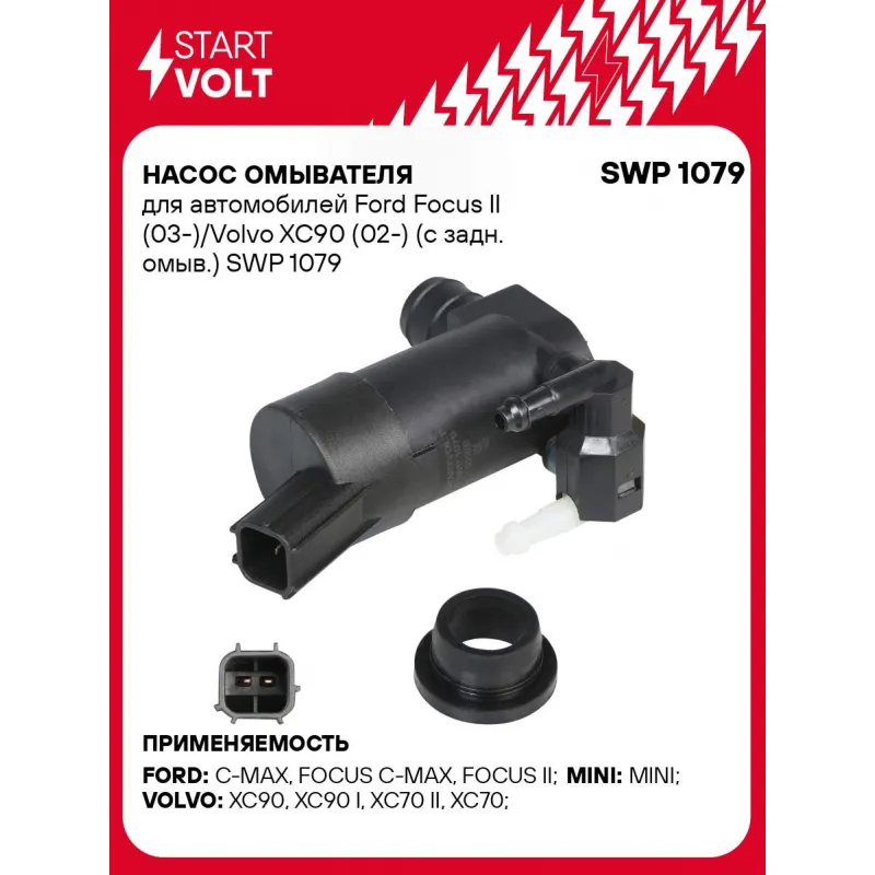 Насос омывателя для автомобилей Ford Focus II (03-)/Volvo XC90 (02-) (с задн. омыв.) Характеристики: Артикул: SWP 1079 OEM номера: 1231600, 1355124, 1S7117K624FD, 1S71-17K624-FE, 30663139, 30699391, 30699952, 31 349 228 Давление, КПа: 160 Количество на автомобиль: 1 Номинальное напряжение, В: 12 Комплектация: Насос омывателя - 1 шт Паспорт изделия/гарантийный талон - 1 шт Гарантия: от 1 года.