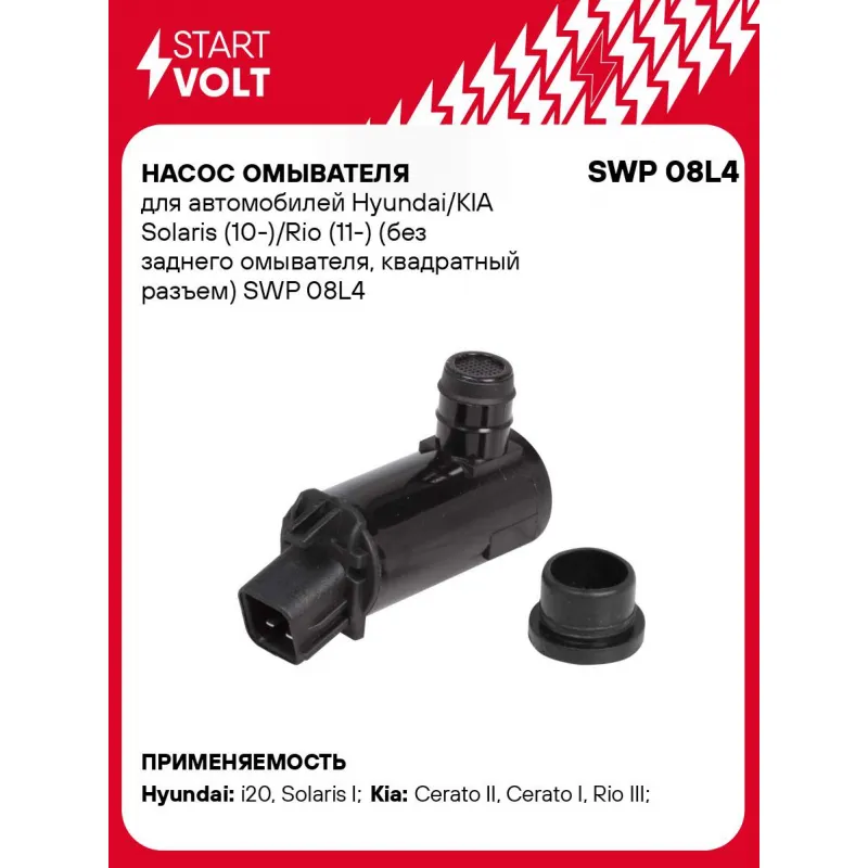 Насос омывателя для автомобилей Hyundai/KIA Solaris (10-)/Rio (11-) (без заднего омывателя, квадратный разъем) Характеристики: Артикул: SWP 08L4 OEM номера: K68124072AA, 6434.C5, 6434C9, 71740987, 01 452 104, 01450172, 12 788 695, 14 52 104, 98510-1C500, 985101C000, 98510-1F000, 98510-1H000, 98510-1J500, 98510-1W010, 98510-3L000, 98510-4F000, 98510-25000 , 9851026000, 98510-2F000, 98510-2G000, 98510-2M500, 98510-2S000, 090508709, 30570333, 90 508 709 Количество на автомобиль: 1 Номинальное напряжение, В: 12 Давление, КПа: 200 Подходит для авто: Hyundai i20 (08-), i20 (08-), Solaris I (10-) Kia Cerato II (09-), Cerato I (04-), Rio III (11-) Для проверки применяемости отправьте VIN автомобиля через вкладку "Есть вопросы о товаре?" Комплектация: Паспорт изделия/гарантийный талон - 1 шт Насос омывателя - 1 шт Уплотнитель - 1 шт Гарантия: от 1 года.