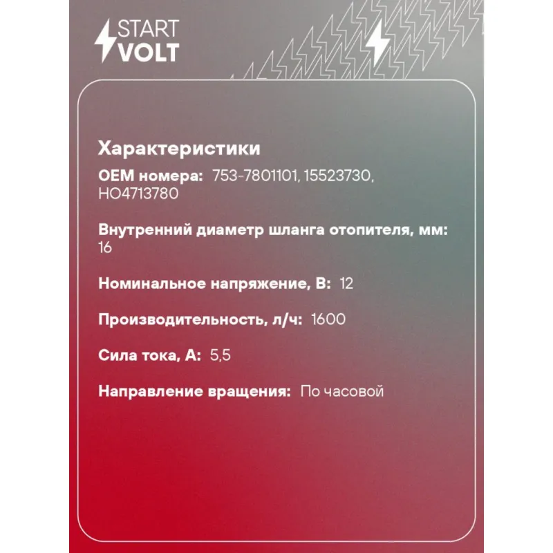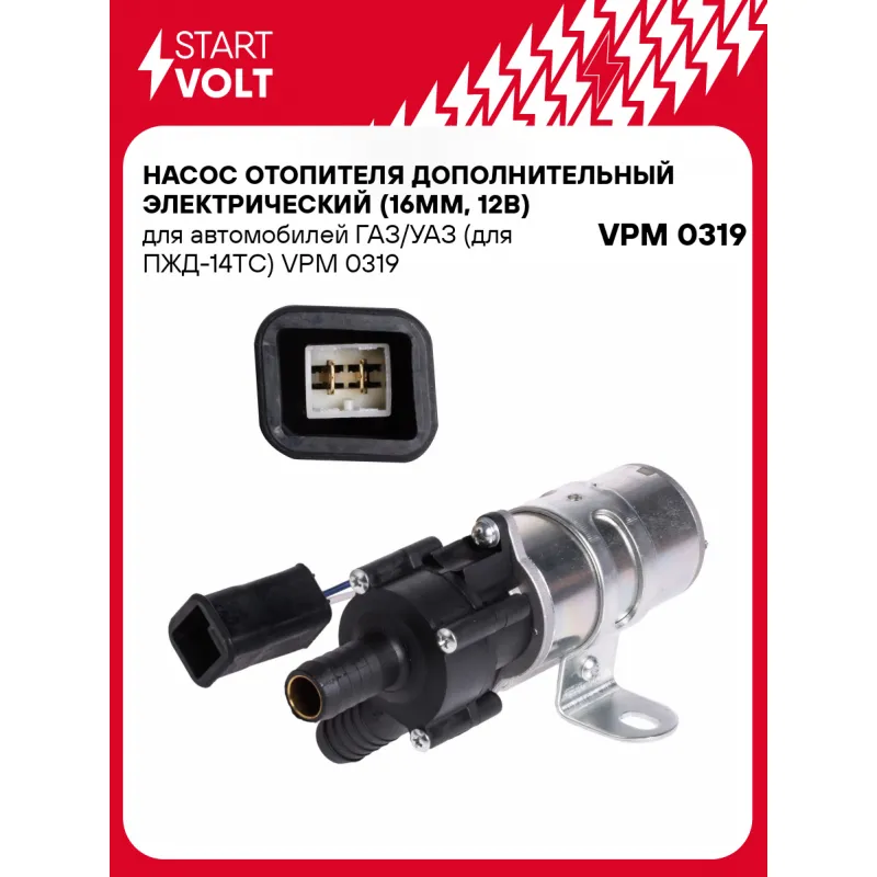 Насос отопителя дополнительный электрический (16мм, 12В) для автомобилей ГАЗ/УАЗ (для ПЖД-14ТС) Характеристики: Артикул: VPM 0319 OEM номера: 753-7801101, 15523730, НО4713780 Номинальное напряжение, В: 12 Производительность, л/ч: 1600 Сила тока, А: 5.5 Направление вращения: по часовой Внутренний диаметр шланга отопителя, мм: 16 Количество на автомобиль: 1 Комплектация: Паспорт изделия/гарантийный талон - 1 шт Насос отопителя дополнительный - 1 шт Гарантия: от 1 года.