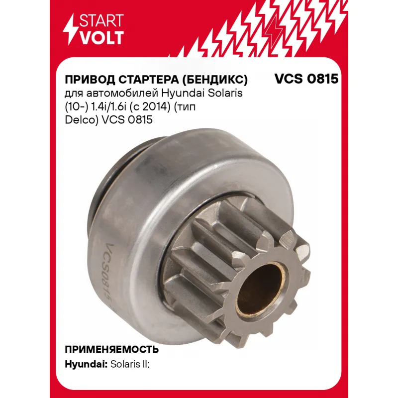 Привод стартера (бендикс) для автомобилей Hyundai Solaris (10-) 1.4i/1.6i (c 2014) (тип Delco) Характеристики: Артикул: VCS 0815 OEM номера: 36145-2B614, 10535802 Направление вращения: по часовой стрелке Внешний диаметр зубьев: 30 Число зубьев: 11 Длина бендикса, мм: 40 Количество шлицов: 8 Количество на автомобиль: 1 Подходит для авто: Hyundai Solaris II (17-) Для проверки применяемости отправьте VIN автомобиля через вкладку "Есть вопросы о товаре?" Комплектация: Паспорт изделия/гарантийный талон Привод стартера (бендикс) - 1 шт Гарантия: от 1 года.
