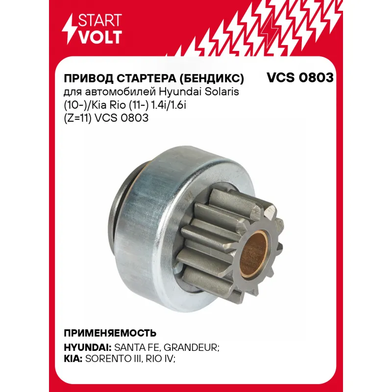 Привод стартера (бендикс) для автомобилей Hyundai Solaris (10-)/Kia Rio (11-) 1.4i/1.6i (Z=11) Характеристики: Артикул: VCS 0803 OEM номера: 36145-2B602 Направление вращения: по часовой стрелке Внешний диаметр зубьев: 30 Число зубьев: 11 Длина бендикса, мм: 40 Количество шлицов: 8 Количество на автомобиль: 1 Комплектация: Привод стартера (бендикс) - 1 шт Паспорт изделия/гарантийный талон Гарантия: от 1 года.
