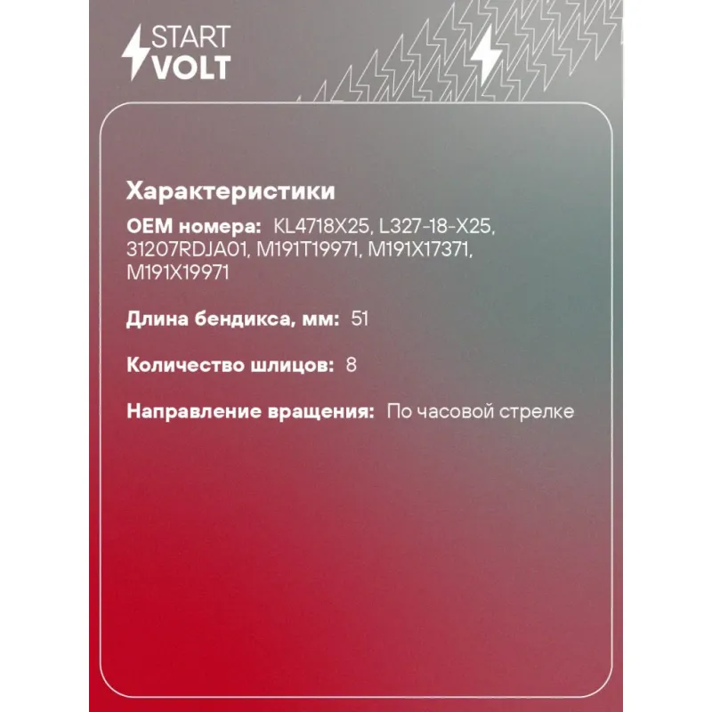 Привод стартера (бендикс) для автомобилей Mazda 6 (GG) (02-) 2.3i Характеристики: Артикул: VCS 2509 OEM номера: KL4718X25, L327-18-X25, 31207RDJA01, M191T19971, M191X17371, M191X19971 Направление вращения: по часовой стрелке Внешний диаметр зубьев: 34,5 Число зубьев: 11 Длина бендикса, мм: 51 Количество шлицов: 8 Количество на а... Читать полностью →
