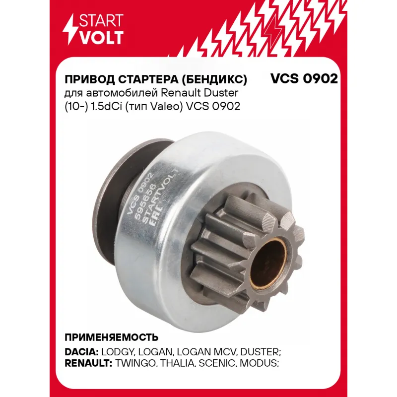 Привод стартера (бендикс) для автомобилей Renault Duster (10-) 1.5dCi (тип Valeo) Характеристики: Артикул: VCS 0902 OEM номера: 595656, 595844, 195041, 195334 Направление вращения: по часовой стрелке Внешний диаметр зубьев: 27,8 Число зубьев: 10 Длина бендикса, мм: 45 Количество шлицов: 10 Количество на автомобиль: 1 Комплектация: Привод стартера (бендикс) - 1 шт Паспорт изделия/гарантийный талон Гарантия: от 1 года.