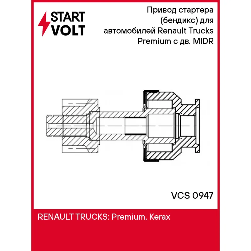 Привод стартера (бендикс) для автомобилей Renault Trucks Premium (96-) с дв. MIDR Характеристики: Артикул: VCS 0947 OEM номера: M009T64971, M009T64972, M9T64971, M9T64972, M009T61473, M009T61474, M009T68771, M9T61473, M9T61474, M9T64791, M9T64792, M9T68771, M009T64791, M009T64792, M009T64973, 74 21 036 377, 74 85 003 371, 21025968, 21036377, 2159844, 85000883, 11127809, 20563533, 22807178, 85000883, 85000934, 85000937, 20732977, 21598436, 21598446, 21598449, 438482, 0001261041, 0986024670, 5001866702, 7485013136, 7421598449, 861179 Направление вращения: по часовой стрелке Внешний диаметр зубьев: 46,4 Число зубьев: 12 Длина бендикса, мм: 135 Количество шлицов: 5 Количество на автомобиль: 1 Комплектация: Привод стартера (бендикс) - 1 шт Паспорт изделия/гарантийный талон Гарантия: от 1 года.