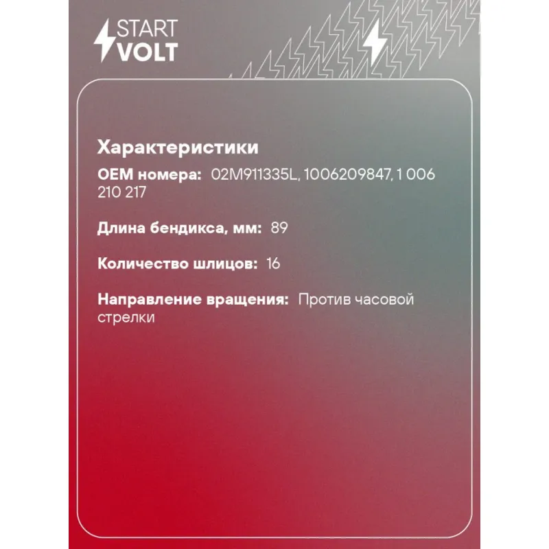 Привод стартера (бендикс) для автомобилей VAG Tiguan (07-)/Transporter T5 (09-) 2.0TDi Характеристики: Артикул: VCS 1817 OEM номера: 02M911335L, 1006209847, 1 006 210 217 Направление вращения: против часовой стрелки Внешний диаметр зубьев: 27,8 Число зубьев: 11 Длина бендикса, мм: 89 Количество шлицов: 16 Количество на автомобиль: 1 Комплектация: Паспорт изделия/гарантийный талон Привод стартера (бендикс) - 1 шт Гарантия: от 1 года.