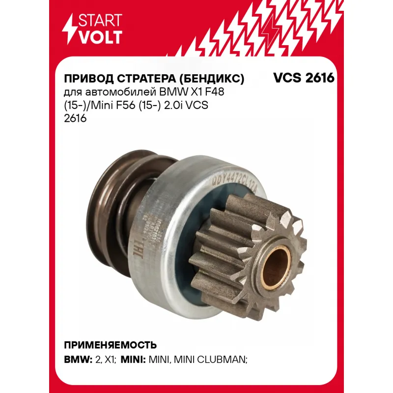 Привод стратера (бендикс) для автомобилей BMW X1 F48 (15-)/Mini F56 (15-) 2.0i Характеристики: Артикул: VCS 2616 OEM номера: 1006210316, 1006210357, 0399D73219, 12417649090, 12417649091, 12418570848, 0001170200, 0001170201, 0001172204, 0001172205 Направление вращения: по часовой стрелке Внешний диаметр зубьев: 34,7 Число зубьев: 13 Длина бендикса, мм: 58 Количество шлицов: 16 Количество на автомобиль: 1 Комплектация: Привод стартера (бендикс) - 1 шт Паспорт изделия/гарантийный талон Гарантия: от 1 года.