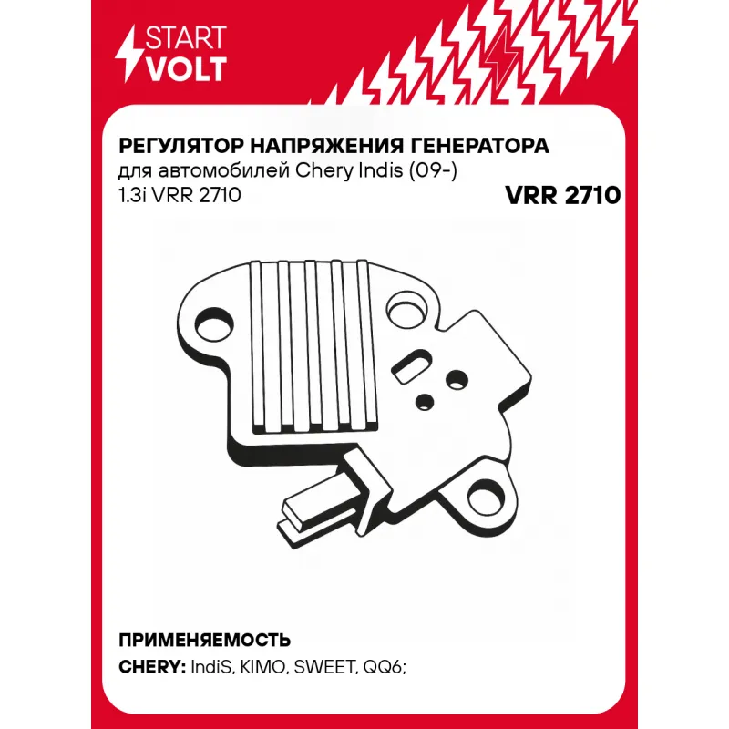 Регулятор напряжения генератора для автомобилей Chery Indis (09-) 1.3i Характеристики: Артикул: VRR 2710 OEM номера: S111RD3701111 Тип сигнала: L-IG Тип питания: Дополнительные диоды Количество на автомобиль: 1 Номинальное напряжение, В: 14 Сила тока, А: 5 Комплектация: Регулятор напряжения генератора - 1 шт Паспорт изделия/гарантийный талон - 1 шт Гарантия: от 1 года.