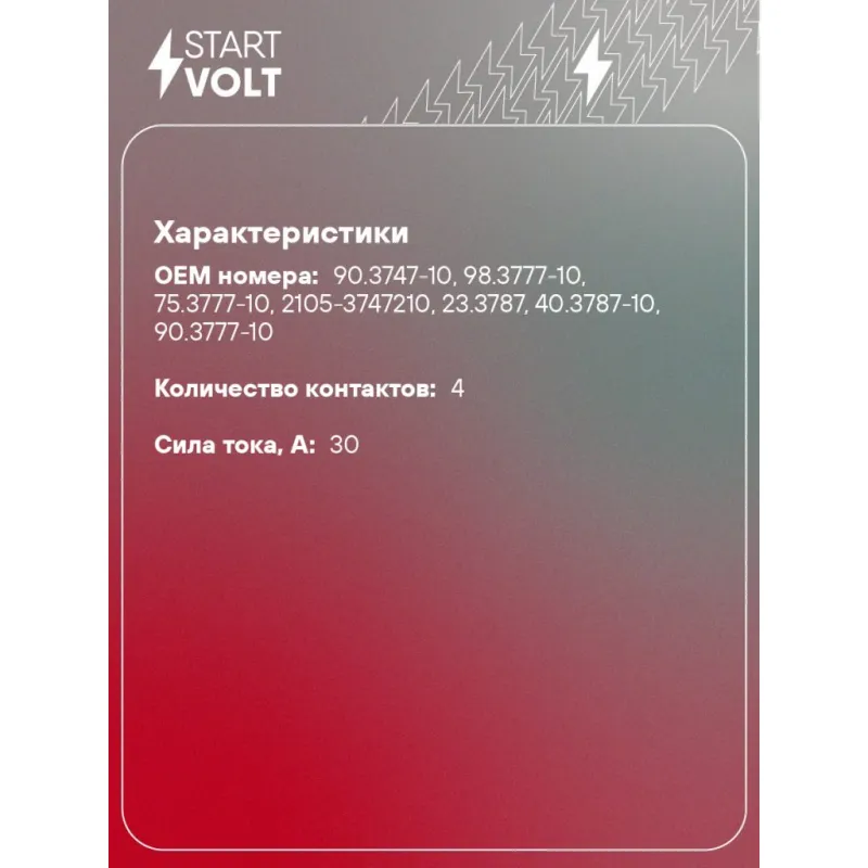 Реле 12V 30A 4 контакта (с кронштейном, без резистора) Характеристики: Артикул: SCR 0104 OEM номера: 90.3747-10, 98.3777-10, 75.3777-10, 2105-3747210, 23.3787, 40.3787-10, 90.3777-10 Количество контактов: 4 Сила тока, А: 30 Номинальное напряpжение, В: 12 Количество на автомобиль: 1 Гарантия: от 1 года.
