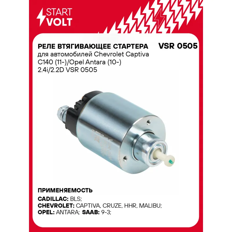 Реле втягивающее стартера для автомобилей Chevrolet Captiva C140 (11-)/Opel Antara (10-) 2.4i/2.2D Характеристики: Артикул: VSR 0505 OEM номера: 10503939, 12609317, 8000213, 8200213, DRS0942, 5556245 Сила тока, А: 10 Резьба: M4 Напряжение, В: 12 Диаметр резьбовых соединений: 40,5 Тип клеммы 30: M8 Тип клеммы 45: M8 Тип клеммы 50: 3x0,9 Количество на автомобиль: 1 Комплектация: Паспорт изделия/гарантийный талон Реле втягивающее стартера - 1 шт Гарантия: от 1 года.