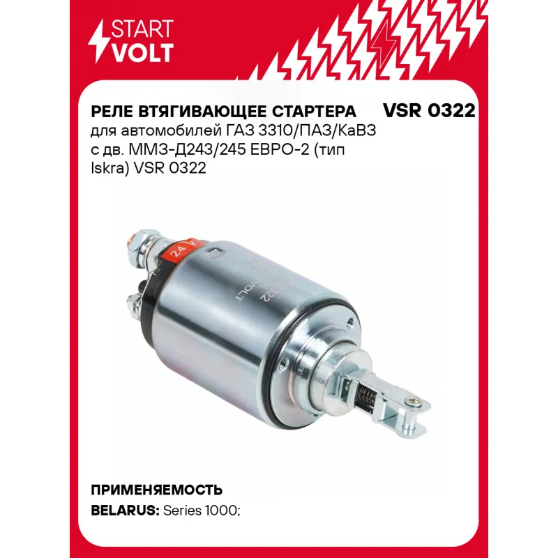 Реле втягивающее стартера для автомобилей ГАЗ 3310/ПАЗ/КаВЗ с дв. ММЗ-Д243/245 ЕВРО-2 (тип Iskra) Характеристики: Артикул: VSR 0322 OEM номера: 16906706, 16908804, AZJ3381, MS 411, 11.131.104, IMS301104 Сила тока, А: 10 Резьба: M5 Напряжение, В: 24 Диаметр резьбовых соединений: 46,5 Тип клеммы 30: M10 Тип клеммы 45: M10 Тип клеммы 50: M5 Количество на автомобиль: 1 Комплектация: Паспорт изделия/гарантийный талон Реле втягивающее стартера - 1 шт Гарантия: от 1 года.