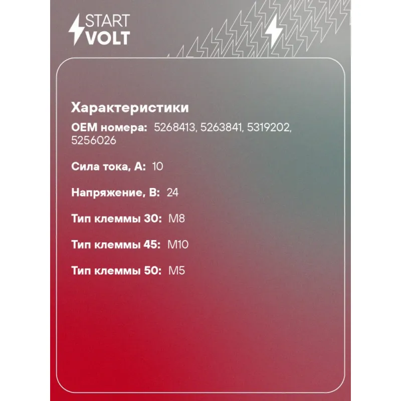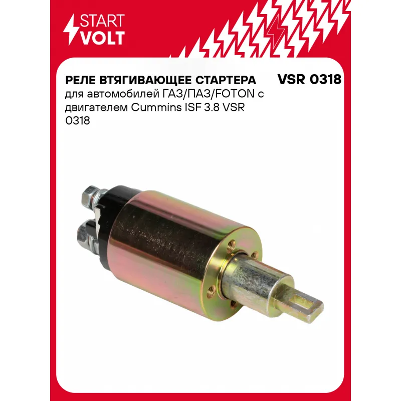 Реле втягивающее стартера для автомобилей ГАЗ/ПАЗ/FOTON c двигателем Cummins ISF 3.8 Характеристики: Артикул: VSR 0318 OEM номера: 5268413, 5263841, 5319202, 5256026 Сила тока, А: 10 Резьба: M6 Напряжение, В: 24 Диаметр резьбовых соединений: 38 Тип клеммы 30: M8 Тип клеммы 45: M10 Тип клеммы 50: M5 Количество на автомобиль: 1 ... Читать полностью →