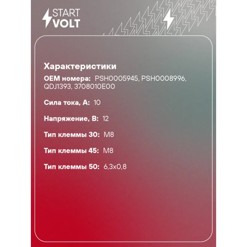 Реле втягивающее стартера для автомобилей ГАЗ ГАЗель Next (22-)/NN (22-) 2.5d [G]/GW Safe (02-) 2.2i Характеристики: Артикул: VSR 3001 OEM номера: РSН0005945, РSН0008996, QDJ1393, 3708010E00 Сила тока, А: 10 Резьба: M6 Напряжение, В: 12 Диаметр резьбовых соединений: 38 Тип клеммы 30: M8 Тип клеммы 45: M8 Тип клеммы 50: 6,3x0,8 Количество на автомобиль: 1 Комплектация: Паспорт изделия/гарантийный талон Реле втягивающее стартера - 1 шт Гарантия: от 1 года.