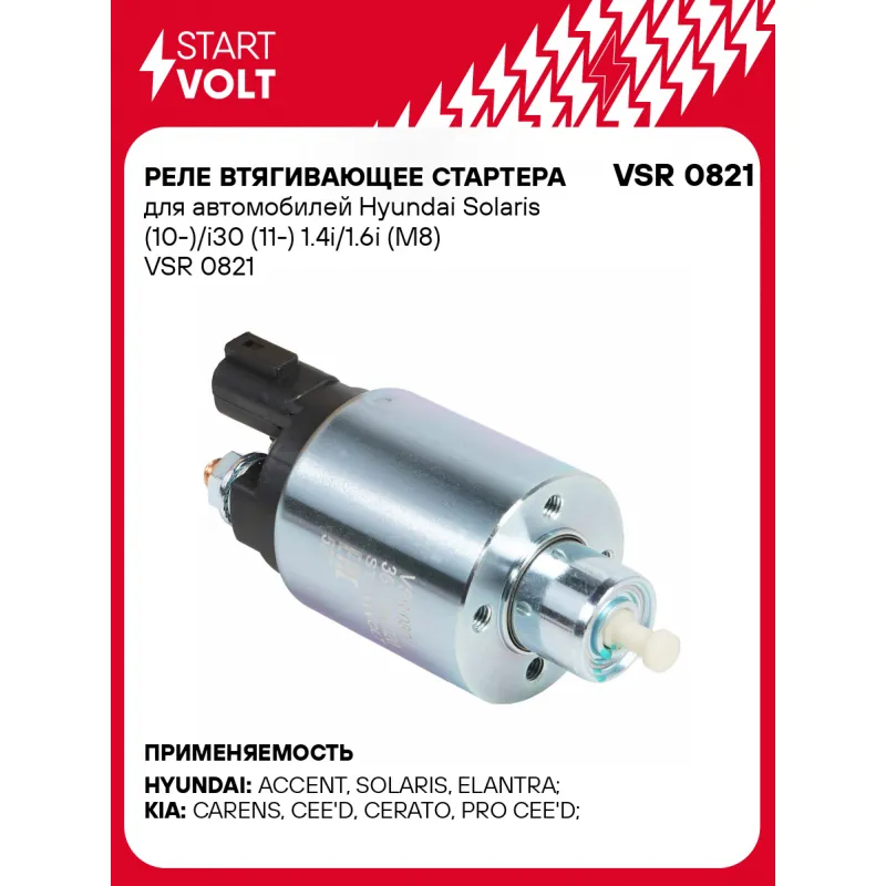 Реле втягивающее стартера для автомобилей Hyundai Solaris (10-)/i30 (11-) 1.4i/1.6i (M8) Характеристики: Артикул: VSR 0821 OEM номера: 361202B020 Сила тока, А: 10 Резьба: M6 Напряжение, В: 12 Диаметр резьбовых соединений: 38 Тип клеммы 30: M8 Тип клеммы 45: M8 Тип клеммы 50: 6x0,9 Количество на автомобиль: 1 Комплектация: Пас... Читать полностью →