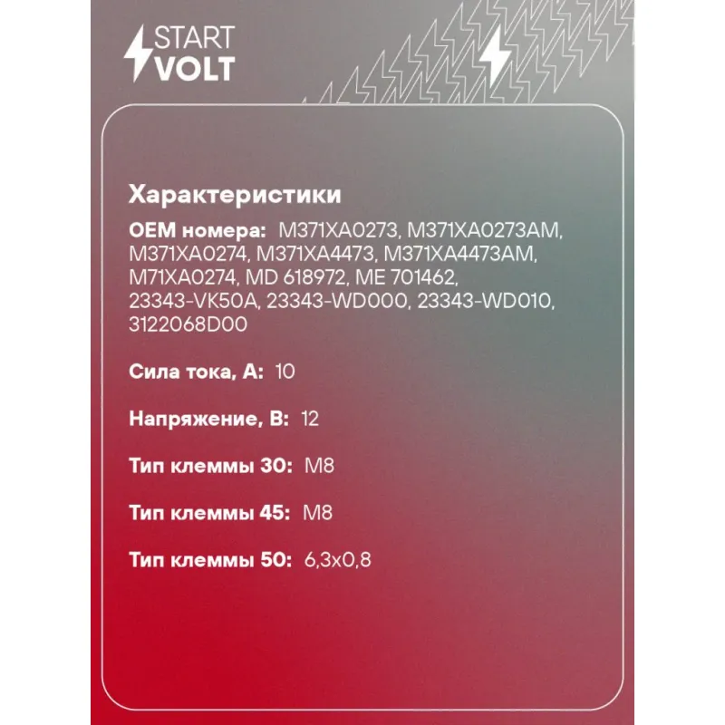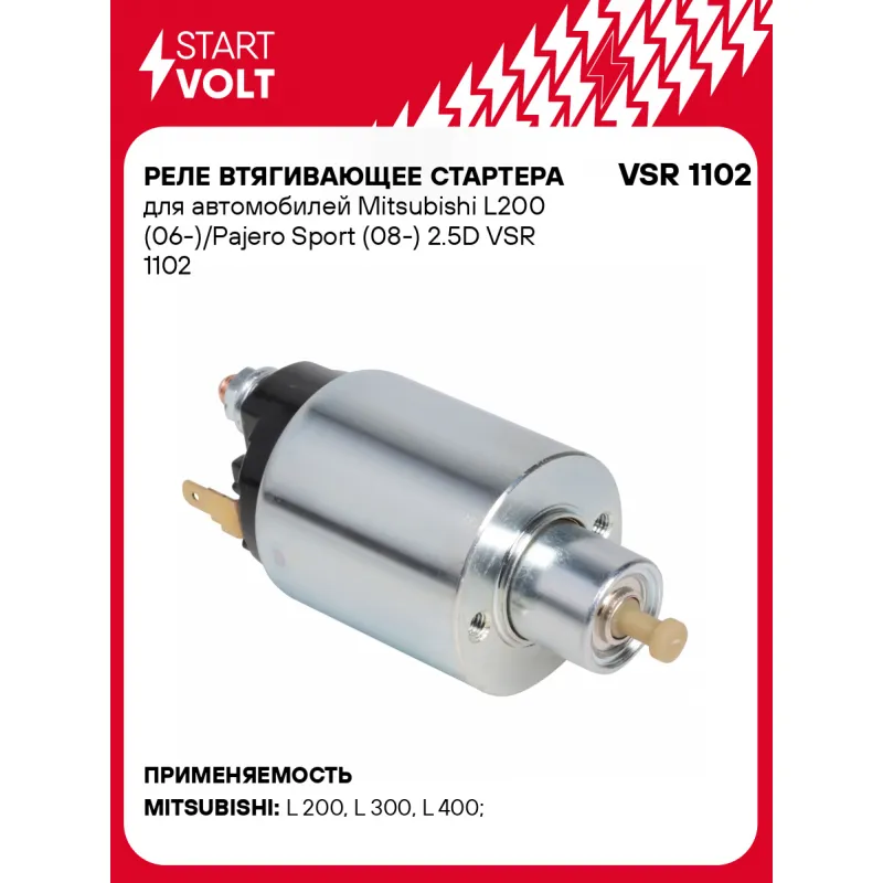 Реле втягивающее стартера для автомобилей Mitsubishi L200 (06-)/Pajero Sport (08-) 2.5D Характеристики: Артикул: VSR 1102 OEM номера: M371XA0273, M371XA0273AM, M371XA0274, M371XA4473, M371XA4473AM, M71XA0274, MD 618972, ME 701462, 23343-VK50A, 23343-WD000, 23343-WD010, 3122068D00, MD619996 Сила тока, А: 10 Количество на автомобиль: 1 Напряжение, В: 12 Диаметр резьбовых соединений: 38 Резьба: M6 Тип клеммы 30: M8 Тип клеммы 45: M8 Тип клеммы 50: 6,3x0,8 Комплектация: Реле втягивающее стартера - 1 шт Паспорт изделия/гарантийный талон Гарантия: от 1 года.