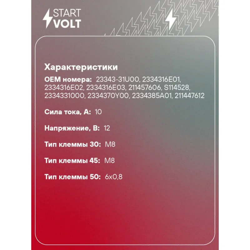 Реле втягивающее стартера для автомобилей Nissan Maxima (94-) 2.5i/3.0i Характеристики: Артикул: VSR 1405 OEM номера: 23343-31U00, 2334316E01, 2334316E02, 2334316E03, 211457606, S114528, 2334331000, 2334370Y00, 2334385A01, 211447612 Сила тока, А: 10 Резьба: M6 Напряжение, В: 12 Диаметр резьбовых соединений: 38 Тип клеммы 30: M8 Тип клеммы 45: M8 Тип клеммы 50: 6x0,8 Количество на автомобиль: 1 Комплектация: Паспорт изделия/гарантийный талон Реле втягивающее стартера - 1 шт Гарантия: от 1 года.