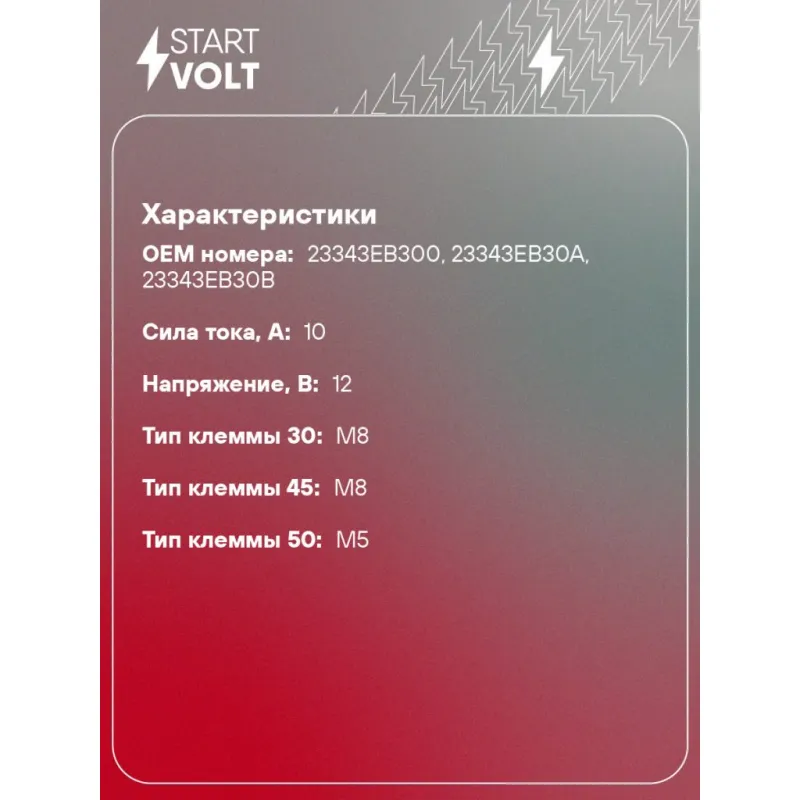 Реле втягивающее стартера для автомобилей Nissan Note E12 (12-) 1.2DIG-S Характеристики: Артикул: VSR 1407 OEM номера: 23343EB300, 23343EB30A, 23343EB30B Резьба: M6 Диаметр резьбовых соединений: 38 Тип клеммы 30: M8 Тип клеммы 45: M8 Тип клеммы 50: M5 Количество на автомобиль: 1 Напряжение, В: 12 Сила тока, А: 10 Комплектация:... Читать полностью →