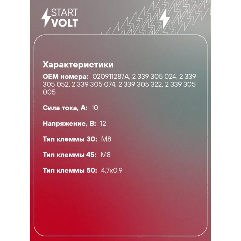 Реле втягивающее стартера для автомобилей VAG Octavia Tour (96-) 5MT Характеристики: Артикул: VSR 1816 OEM номера: 020911287A, 2 339 305 024, 2 339 305 052, 2 339 305 074, 2 339 305 322, 2 339 305 005 Резьба: M5 Диаметр резьбовых соединений: 41 Тип клеммы 30: M8 Тип клеммы 45: M8 Тип клеммы 50: 4,7x0,9 Количество на автомобиль: 1 Напряжение, В: 12 Сила тока, А: 10 Комплектация: Реле втягивающее стартера - 1 шт Паспорт изделия/гарантийный талон Гарантия: от 1 года.