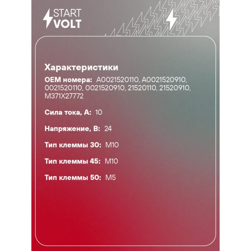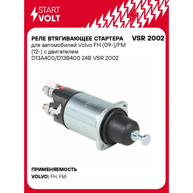 Реле втягивающее стартера для автомобилей Volvo FH (09-)/FM (12-) с двигателем D13A400/D13B400 24В Характеристики: Артикул: VSR 2002 OEM номера: A0021520110, A0021520910, 0021520110, 0021520910, 21520110, 21520910, M371X27772 Сила тока, А: 10 Резьба: M6 Напряжение, В: 24 Диаметр резьбовых соединений: 59 Тип клеммы 30: M10 Тип кл... Читать полностью →