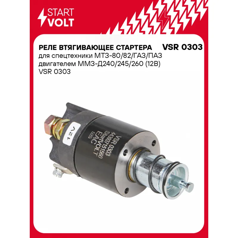 Реле втягивающее стартера для спецтехники МТЗ-80/82/ГАЗ/ПАЗ двигателем ММЗ-Д240/245/260 (12В) Характеристики: Артикул: VSR 0303 OEM номера: 443937151560, 7152560, 7153142, 7153182, 7153612, 7153912, 7154142, 7.155.632 Сила тока, А: 10 Резьба: M5 Напряжение, В: 12 Диаметр резьбовых соединений: 45 Тип клеммы 30: M8 Тип клеммы 45: M10 Тип клеммы 50: M5 Количество на автомобиль: 1 Комплектация: Паспорт изделия/гарантийный талон Реле втягивающее стартера - 1 шт Гарантия: от 1 года.