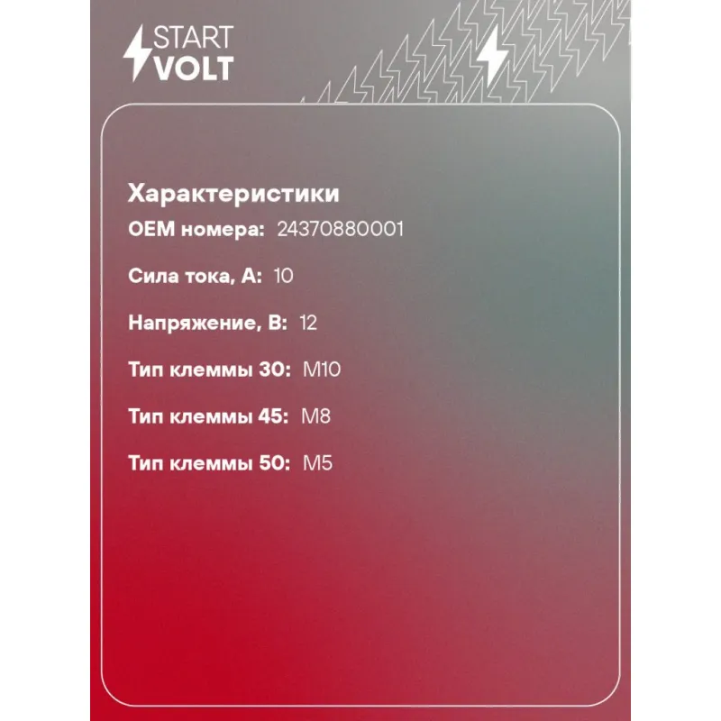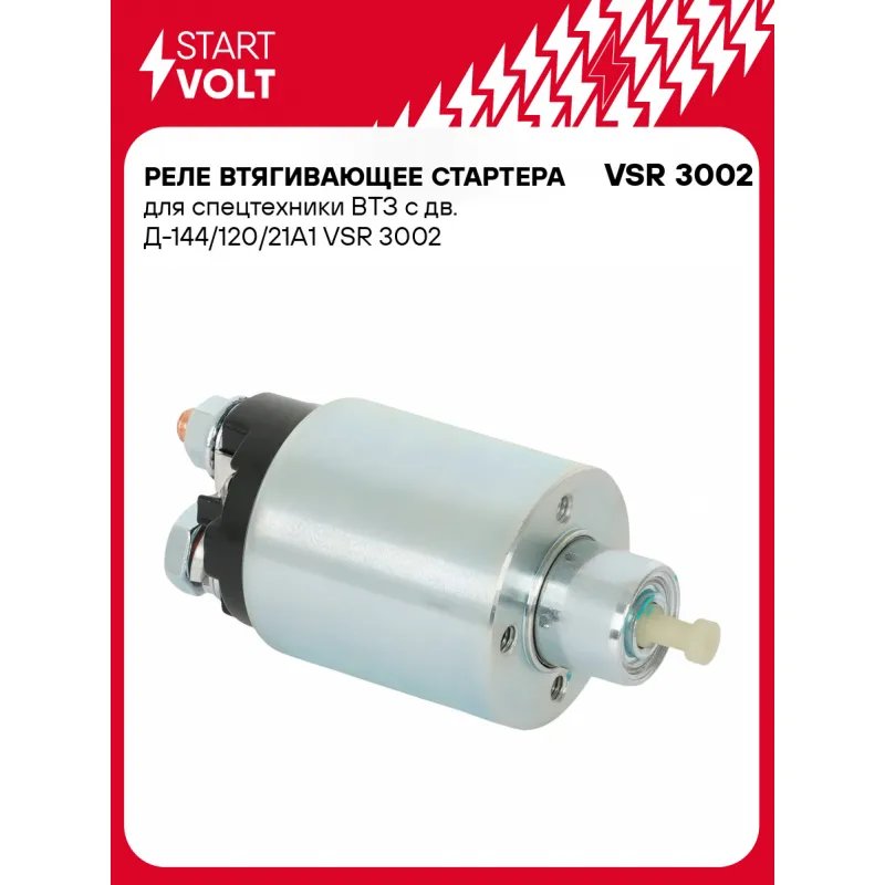 Реле втягивающее стартера для спецтехники ВТЗ с дв. Д-144/120/21А1 Характеристики: Артикул: VSR 3002 OEM номера: 24370880001 Сила тока, А: 10 Резьба: М6 Напряжение, В: 12 Диаметр резьбовых соединений: 38 Тип клеммы 30: M10 Тип клеммы 45: М8 Тип клеммы 50: M5 Количество на автомобиль: 1 Комплектация: Паспорт изделия/гарантийны... Читать полностью →