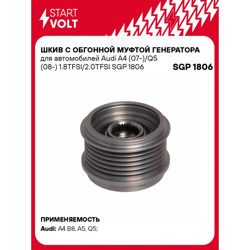 Шкив с обгонной муфтой генератора для автомобилей Audi A4 (07-)/Q5 (08-) 1.8TFSI/2.0TFSI Характеристики: Артикул: SGP 1806 OEM номера: 06J903119, 06H903201H, 06H903201D, 06H903201C, 06H903119B, 06H903119A, 06H903119, 06A903119, 535 0210 10 Длина, мм: 41,6 Внутренний диаметр, мм: 17 Наружный диаметр, мм: 56 Количество ручьев: 6 Вылет шкива, мм: 12,4 Внутренняя резьба: M16x1,5 Количество на автомобиль: 1 Подходит для авто: Audi A4 B8 (07-), A5 (07-), Q5 (08-) Для проверки применяемости отправьте VIN автомобиля через вкладку "Есть вопросы о товаре?" Гарантия: от 1 года.