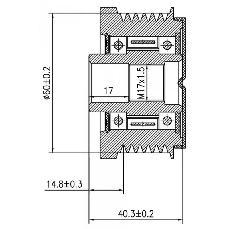 Шкив с обгонной муфтой генератора для автомобилей Mercedes-Benz E W210 (95-)/C W202 (93-) 2.2D Характеристики: Артикул: SGP 1755 OEM номера: A 010 154 48 02, A 010 154 48 02 80, A 011 154 00 02, A 011 154 00 02 80, 010 154 48 02, 010 154 48 02 80, 011 154 00 02, 011 154 00 02 80, 101544802, 111540002, 0123320041, 0123320046, 0123340007, 0124325227, 535022010, F552496, F552498 Длина, мм: 40,3 Внутренний диаметр, мм: 17 Наружный диаметр, мм: 60 Количество ручьев: 6 Вылет шкива, мм: 14,8 Внутренняя резьба: M17x1,5 Количество на автомобиль: 1 Гарантия: от 1 года.