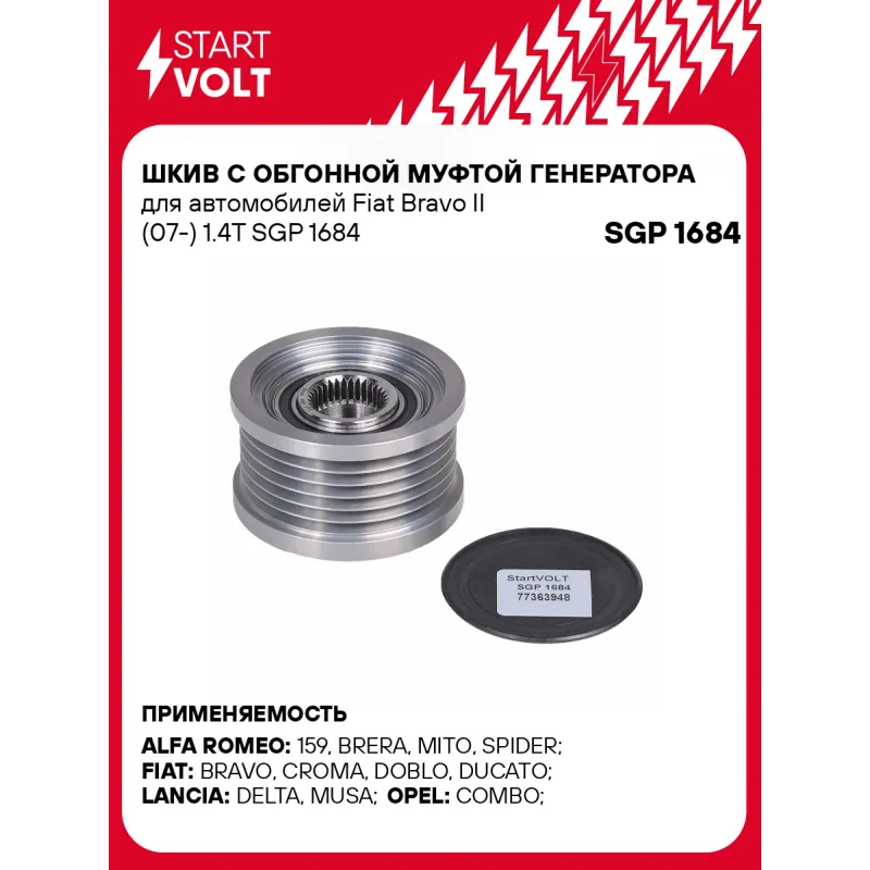 Шкив с обгонной муфтой генератора для автомобилей Fiat Bravo II (07-) 1.4T Характеристики: Артикул: SGP 1684 OEM номера: 77364725, 77363948, 95520426, 12 05 029, 12 759 596, 535 0112 10 Длина, мм: 40,9 Внутренний диаметр, мм: 17 Наружный диаметр, мм: 53,98 Количество ручьев: 6 Вылет шкива, мм: 16,4 Внутренняя резьба: M17x1,5 Количество на автомобиль: 1 Гарантия: от 1 года.
