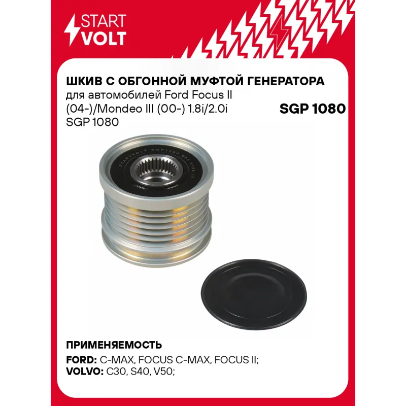 Шкив с обгонной муфтой генератора для автомобилей Ford Focus II (04-)/Mondeo III (00-) 1.8i/2.0i Характеристики: Артикул: SGP 1080 OEM номера: 535 0182 10 Длина, мм: 44,6 Внутренний диаметр, мм: 17 Наружный диаметр, мм: 49,1 Количество ручьев: 6 Вылет шкива, мм: 18 Внутренняя резьба: M14x1,5 Количество на автомобиль: 1 Гарантия: от 1 года.