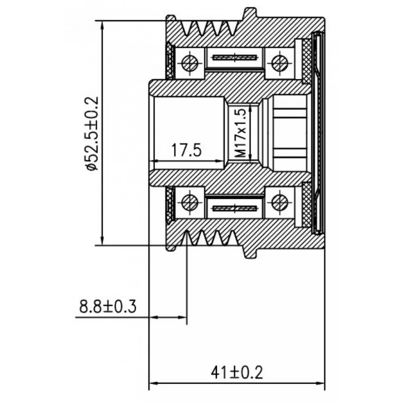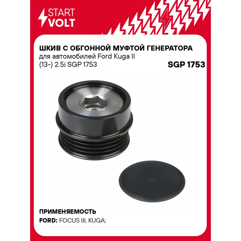 Шкив с обгонной муфтой генератора для автомобилей Ford Kuga II (13-) 2.5i Характеристики: Артикул: SGP 1753 OEM номера: CV6E10352AA, CV6E10A352AA, CV6Z10344A Длина, мм: 41 Внутренний диаметр, мм: 17 Наружный диаметр, мм: 52,5 Количество ручьев: 4 Вылет шкива, мм: 8,8 Внутренняя резьба: M17x1,5 Количество на автомобиль: 1 Гарантия: от 1 года.