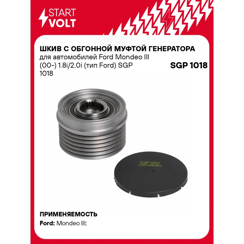 Шкив с обгонной муфтой генератора для автомобилей Ford Mondeo III (00-) 1.8i/2.0i (тип Ford) Характеристики: Артикул: SGP 1018 OEM номера: 1S7U10A352, 1S7U10A352DB, 1S7U10A352EA, 588065, 535007410 Длина, мм: 36,7 Внутренний диаметр, мм: 17 Наружный диаметр, мм: 53 Количество ручьев: 6 Вылет шкива, мм: 6,7 Внутренняя резьба: M16x1,5 Количество на автомобиль: 1 Подходит для авто: Ford Mondeo III (00-) Для проверки применяемости отправьте VIN автомобиля через вкладку "Есть вопросы о товаре?" Гарантия: от 1 года.