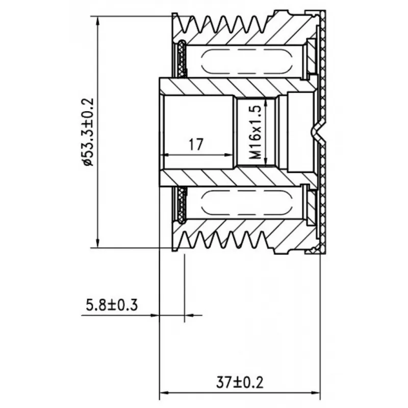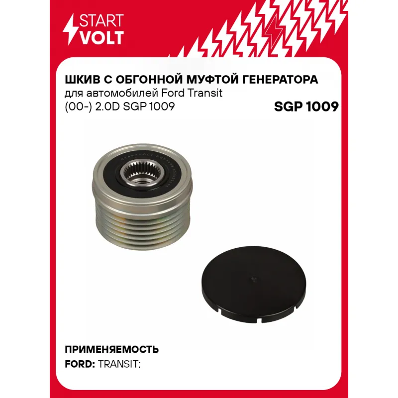 Шкив с обгонной муфтой генератора для автомобилей Ford Transit (00-) 2.0D Характеристики: Артикул: SGP 1009 OEM номера: 535 0223 10, 5350223000, F-556615.01 Длина, мм: 37 Внутренний диаметр, мм: 17 Наружный диаметр, мм: 53,3 Количество ручьев: 6 Вылет шкива, мм: 5,8 Внутренняя резьба: M16x1,5 Количество на автомобиль: 1 Гарантия: от 1 года.