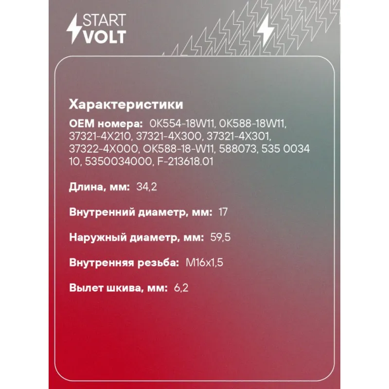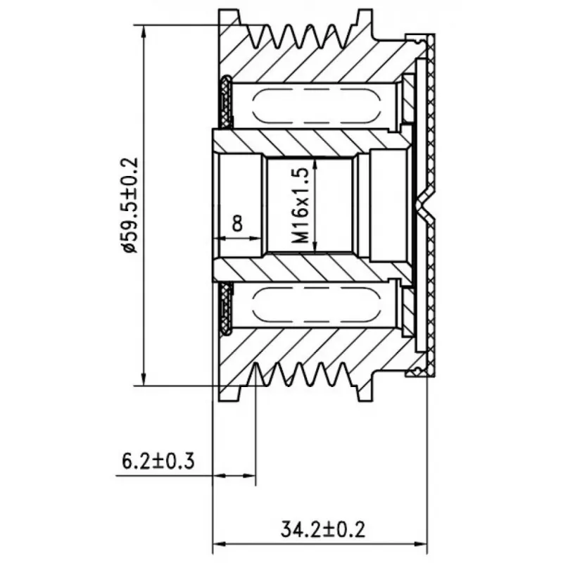 Шкив с обгонной муфтой генератора для автомобилей Hyundai Terracan (01-)/Kia Carnival (05-) 2.9CRDi (SGP 0893) Характеристики: Артикул: SGP 0893 OEM номера: 0K554-18W11, 0K588-18W11, 37321-4X210, 37321-4X300, 37321-4X301, 37322-4X000, OK588-18-W11, 588073, 535 0034 10, 5350034000, F-213618.01, F-213618.1, F-231618, F-231618.01, F-231618.02, F-231618.04, F-231618.05, F-231618.07, F-231618.1, F-231618.5 Длина, мм: 34,2 Внутренний диаметр, мм: 17 Наружный диаметр, мм: 59,5 Количество ручьев: 5 Вылет шкива, мм: 6,2 Внутренняя резьба: M16x1,5 Количество на автомобиль: 1 Гарантия: от 1 года.