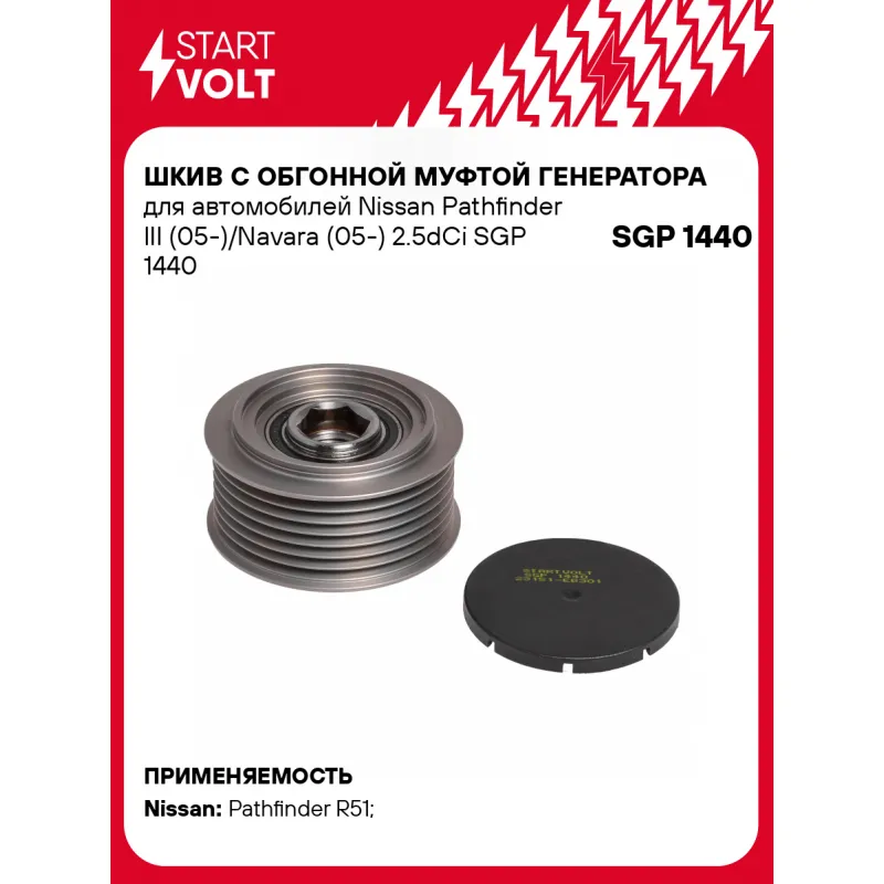 Шкив с обгонной муфтой генератора для автомобилей Nissan Pathfinder III (05-)/Navara (05-) 2.5dCi Характеристики: Артикул: SGP 1440 OEM номера: 535 0177 10, 23151-EB301, 23151-EB30A, A2 52C5 64FE, 1 987 945 410 Длина, мм: 39,5 Внутренний диаметр, мм: 17 Наружный диаметр, мм: 64,9 Количество ручьев: 7 Вылет шкива, мм: 10 Внутренняя резьба: M17x1,5 Количество на автомобиль: 1 Подходит для авто: Nissan Pathfinder R51 (05-) Для проверки применяемости отправьте VIN автомобиля через вкладку "Есть вопросы о товаре?" Гарантия: от 1 года.