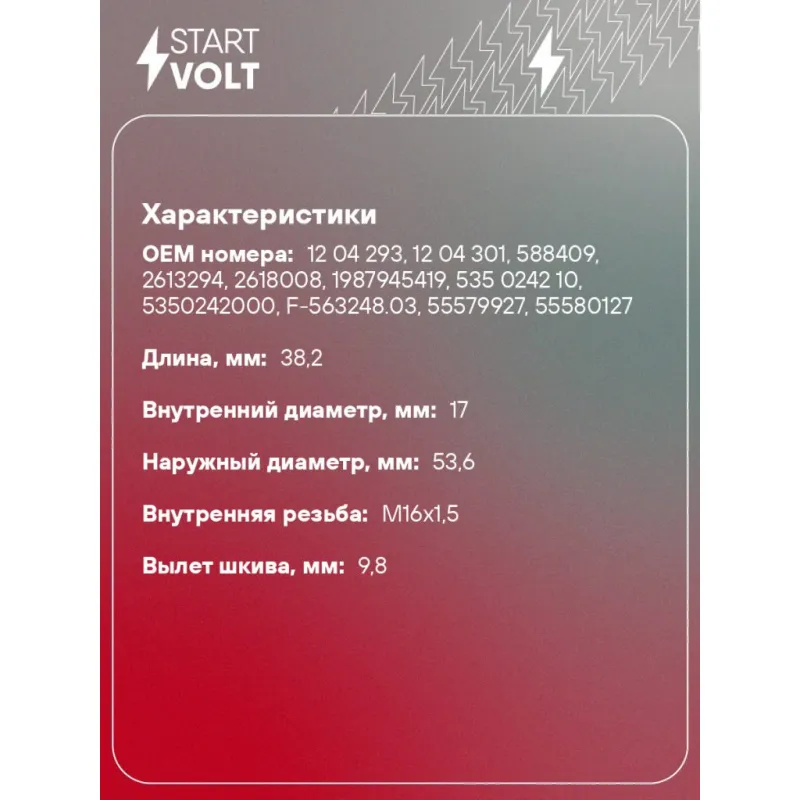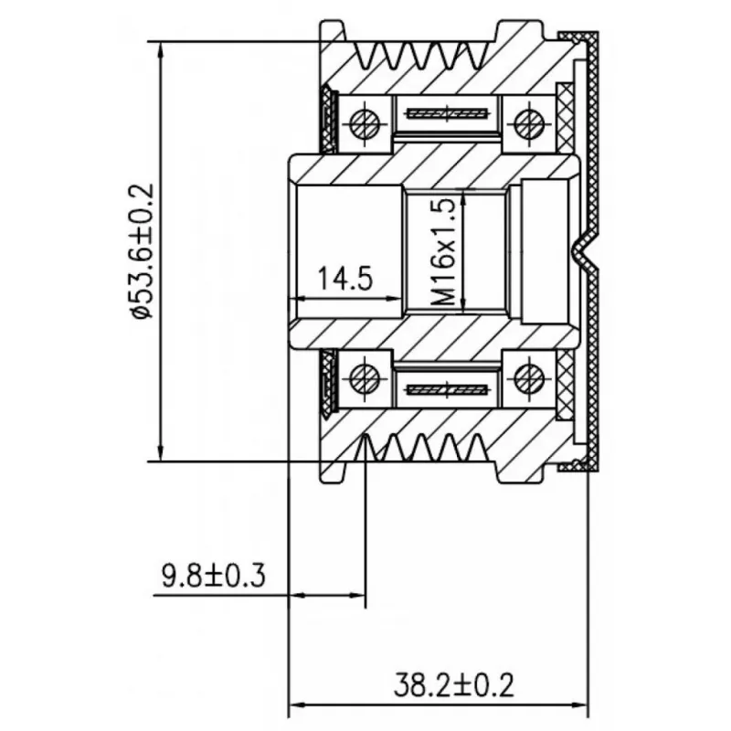 Шкив с обгонной муфтой генератора для автомобилей Opel Astra J (09-) 1.4T/Corsa D (06-) 1.2i/1.4i Характеристики: Артикул: SGP 2108 OEM номера: 12 04 293, 12 04 301, 588409, 2613294, 2618008, 1987945419, 535 0242 10, 5350242000, F-563248.03, 55579927, 55580127 Длина, мм: 38,2 Внутренний диаметр, мм: 17 Наружный диаметр, мм: 53,6 Количество ручьев: 5 Вылет шкива, мм: 9,8 Внутренняя резьба: M16x1,5 Количество на автомобиль: 1 Гарантия: от 1 года.