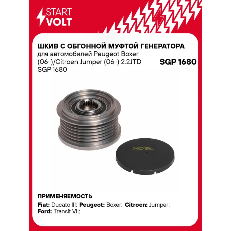 Шкив с обгонной муфтой генератора для автомобилей Peugeot Boxer (06-)/Citroen Jumper (06-) 2.2JTD Характеристики: Артикул: SGP 1680 OEM номера: 535 0160 10, 7 736 4082, 77366957 Длина, мм: 36,3 Внутренний диаметр, мм: 17 Наружный диаметр, мм: 58,6 Количество ручьев: 6 Вылет шкива, мм: 8 Внутренняя резьба: M16x1,5 Количество на автомобиль: 1 Подходит для авто: Fiat Ducato III (06-) Peugeot Boxer (06-) Citroen Jumper (06-) Ford Transit VII (06-) Для проверки применяемости отправьте VIN автомобиля через вкладку "Есть вопросы о товаре?" Гарантия: от 1 года.