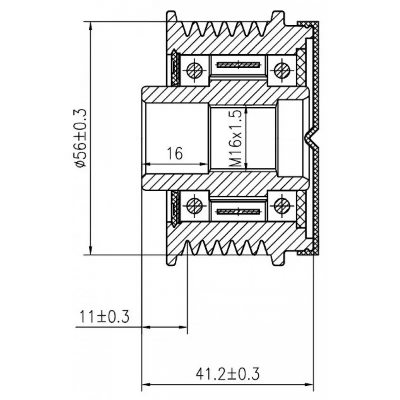 Шкив с обгонной муфтой генератора для автомобилей Renault Laguna (01-) 1.8i/2.0i (SGP 0907) Характеристики: Артикул: SGP 0907 OEM номера: 77 01 055 871, 77 01 207 807, 77 01 477 502, 8200613765, 31251071, 8641982, 3345812, 2546952, 593515, 593517, 1987945406, 535 0028 10, 5350028000, F-228881.02, F-228881.03, F-228881.2, F-228881.3, F-235152.3, F-235152.4, F-556599, F-556599.01, F-235152.01, F-235152.02, F-235152.03, F-235152.04, F-235152.1, F-235152.2 Длина, мм: 41,2 Внутренний диаметр, мм: 17 Наружный диаметр, мм: 56 Количество ручьев: 6 Вылет шкива, мм: 11 Внутренняя резьба: M16x1,5 Количество на автомобиль: 1 Гарантия: от 1 года.