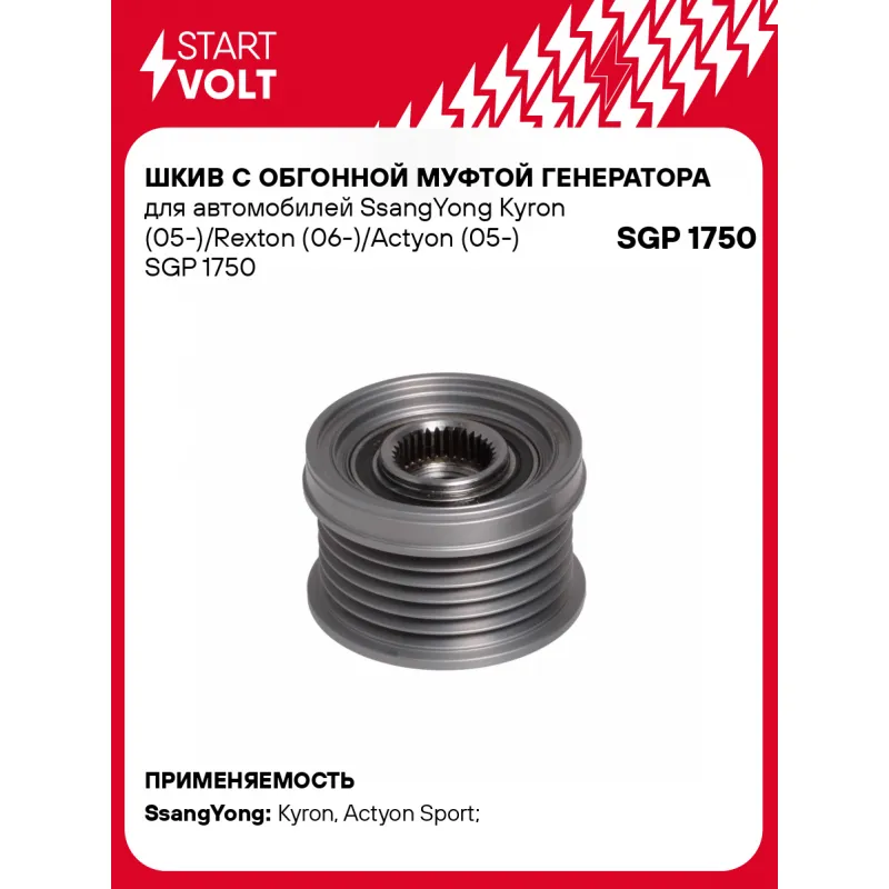Шкив с обгонной муфтой генератора для автомобилей SsangYong Kyron (05-)/Rexton (06-)/Actyon (05-) Характеристики: Артикул: SGP 1750 OEM номера: 535 0134 10, A6041500660, 6041500460, 6041500660, A6041500460, 66215-531A5, 66215-53315 Длина, мм: 36,1 Внутренний диаметр, мм: 17 Наружный диаметр, мм: 49,7 Количество ручьев: 6 Вылет шкива, мм: 5,34 Внутренняя резьба: M16x1,5 Количество на автомобиль: 1 Подходит для авто: SsangYong Kyron (05-), Actyon Sport (05-), Rexton (06-), Kyron (05-), Actyon (05-) Для проверки применяемости отправьте VIN автомобиля через вкладку "Есть вопросы о товаре?" Гарантия: от 1 года.