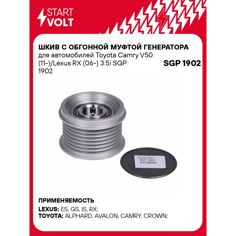 Шкив с обгонной муфтой генератора для автомобилей Toyota Camry V50 (11-)/Lexus RX (06-) 3.5i Характеристики: Артикул: SGP 1902 OEM номера: 27415-0W010, 27415-0W060, 27415-0W061, 27415-0W062, 27415-0W063, 27415-0W130, 27415-0W131, 535 0209 10 Длина, мм: 52 Внутренний диаметр, мм: 17 Наружный диаметр, мм: 52,5 Количество ручьев: 7 Вылет шкива, мм: 9 Внутренняя резьба: M14x1,5 Количество на автомобиль: 1 Гарантия: от 1 года.