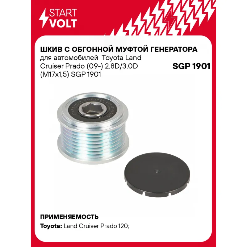 Шкив с обгонной муфтой генератора для автомобилей Toyota Land Cruiser Prado (09-) 2.8D/3.0D (M17x1,5) Характеристики: Артикул: SGP 1901 OEM номера: 27415-0L050, 27415-26010, 27415-30010, 27415-30011, 535 0232 10 Длина, мм: 42,4 Внутренний диаметр, мм: 17 Наружный диаметр, мм: 58 Количество ручьев: 7 Вылет шкива, мм: 11 Внутренняя резьба: M14x1,5 Количество на автомобиль: 1 Подходит для авто: Toyota Land Cruiser Prado 120 (02-), Land Cruiser Prado 150 (09-), Hilux (05-), Hilux (15-), Fortuner (15-) Для проверки применяемости отправьте VIN автомобиля через вкладку "Есть вопросы о товаре?" Гарантия: от 1 года.
