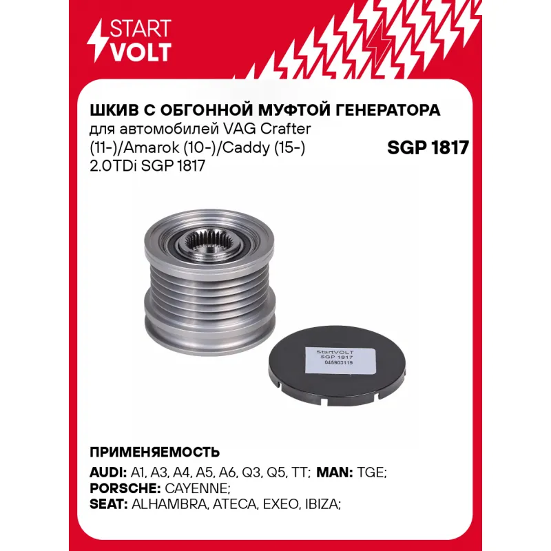 Шкив с обгонной муфтой генератора для автомобилей VAG Crafter (11-)/Amarok (10-)/Caddy (15-) 2.0TDi Характеристики: Артикул: SGP 1817 OEM номера: 65.95820-0000, 03G 903 119 B, 045 903 119 A, 045 903 119, 06J 903 119 A, 535 0124 10, 55140602 Длина, мм: 40,15 Внутренний диаметр, мм: 17 Наружный диаметр, мм: 49,35 Количество ручьев: 6 Вылет шкива, мм: 14,55 Внутренняя резьба: M16x1,5 Количество на автомобиль: 1 Гарантия: от 1 года.