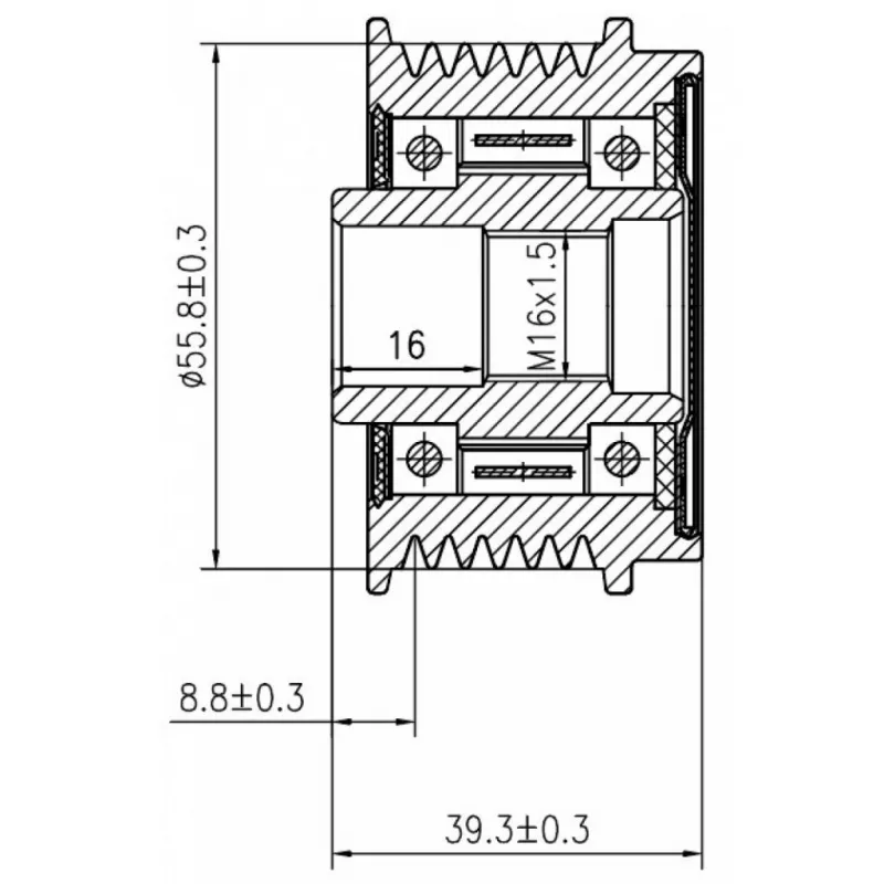 Шкив с обгонной муфтой генератора для автомобилей VAG Fabia (07-) 1.2i Характеристики: Артикул: SGP 1834 OEM номера: 028903018K, 028903119B, 028903119M, 03D903119, 03D 903 119 A, 03D903119D, 2220306, 2548207, 583516, 588013, 1987945420, 93297735, 535006010, F233593, F-233593.04, F-233593.05, F-233593.1, F-233593.03, F-233593.31, F-233593.32 Длина, мм: 39,3 Внутренний диаметр, мм: 17 Наружный диаметр, мм: 55,8 Количество ручьев: 6 Вылет шкива, мм: 8,8 Внутренняя резьба: M16x1,5 Количество на автомобиль: 1 Гарантия: от 1 года.