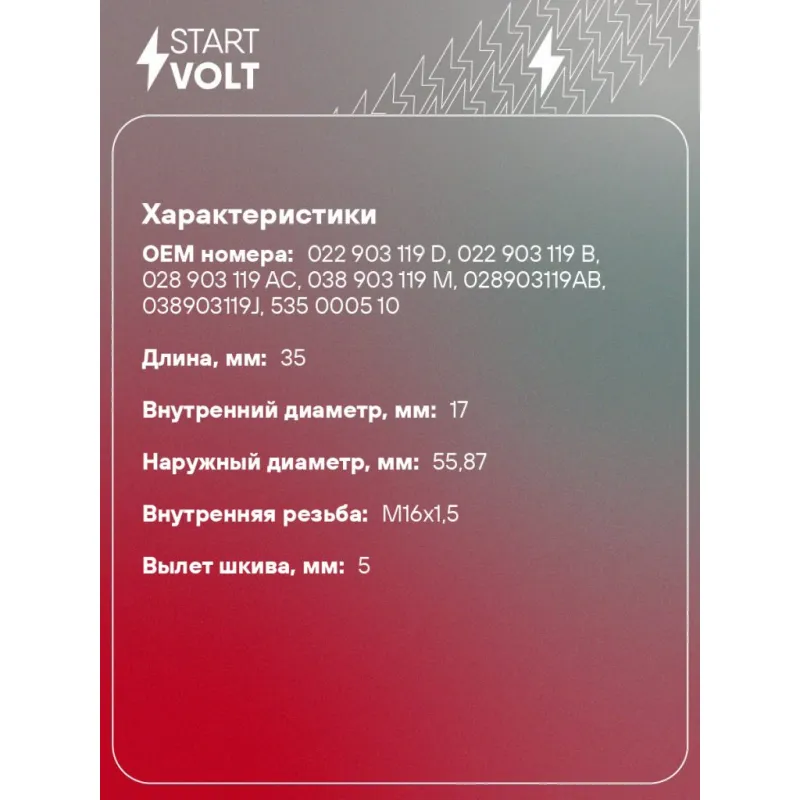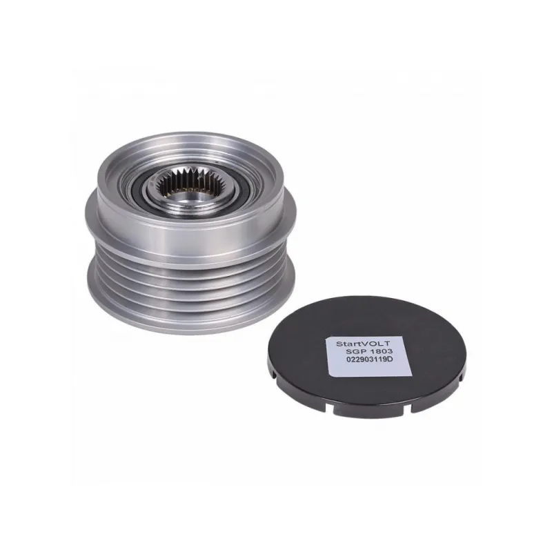 Шкив с обгонной муфтой генератора для автомобилей VAG Passat B5 (96-)/A4 994-) 1.6i/1.8T Характеристики: Артикул: SGP 1803 OEM номера: 022 903 119 D, 022 903 119 B, 028 903 119 AC, 038 903 119 M, 028903119AB, 038903119J, 535 0005 10 Длина, мм: 35 Внутренний диаметр, мм: 17 Наружный диаметр, мм: 55,87 Количество ручьев: 5 Вылет шкива, мм: 5 Внутренняя резьба: M16x1,5 Количество на автомобиль: 1 Гарантия: от 1 года.