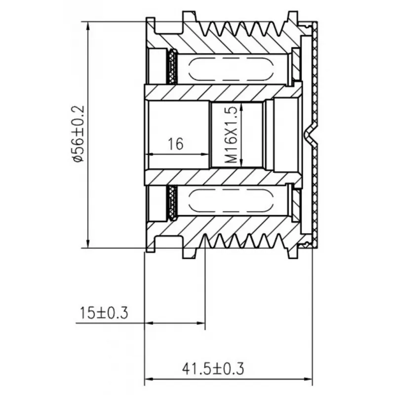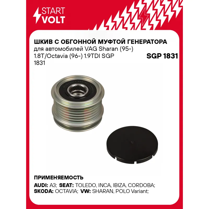Шкив с обгонной муфтой генератора для автомобилей VAG Sharan (95-) 1.8T/Octavia (96-) 1.9TDI Характеристики: Артикул: SGP 1831 OEM номера: 038903119, 038903165, 38903165, 588024, 1126601559, 1127011844, 1127011845, F00M991388, 535 0010 10, 5350010000, F-226804, F-226804.04, F-226804.05, F-226804.07, F-226804.08, F-226804.09, F-226804.4, F-226804.5, F-226804.6, F-226804.7 Длина, мм: 41,5 Внутренний диаметр, мм: 17 Наружный диаметр, мм: 56 Количество ручьев: 6 Вылет шкива, мм: 15 Внутренняя резьба: M16x1,5 Количество на автомобиль: 1 Гарантия: от 1 года.
